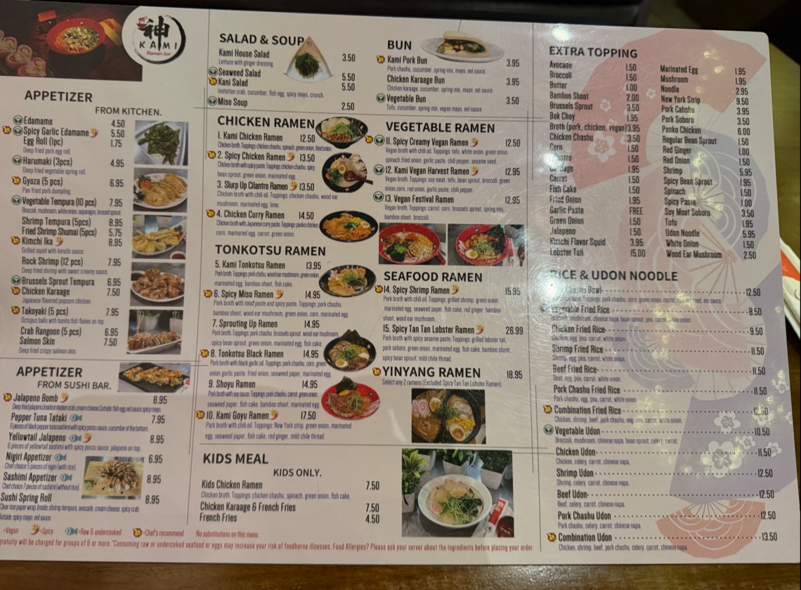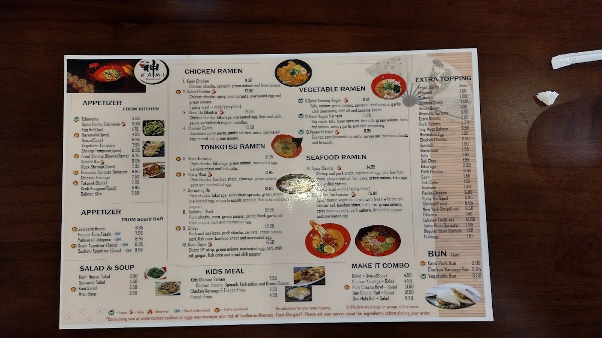 Complete your experience with desserts like mochi and tiramisu, or sip on refreshing Thai tea. Overall, Kami Ramen & Sushi presents an inviting atmosphere, excellent service, and an exceptional menu that guarantees a memorable dining experience.
